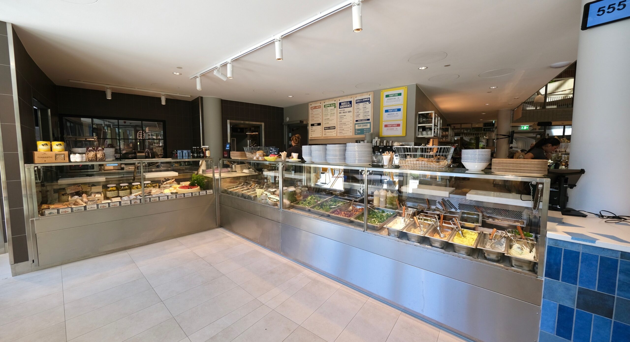 For this project, we have equipped all the kitchens, the bakery, and the deli with refrigeration furniture from Haglund Industri, including everything from deli counters, display coolers, refrigerated showcases, refrigerated tables, and proofing cabinets to wine coolers. In the open restaurant kitchen, we have a cooking line from Palux Topline in hygienic design, ovens from Rational, and a custom-built charcoal grill with glass doors facing the dining area. Heat lamps from Stayhot. In the prep kitchen, there is a classic frying table and induction stove from Fribergs, a combination frying table iVario, a cooking pot from Getinge, and a mixing machine from Agrenco.